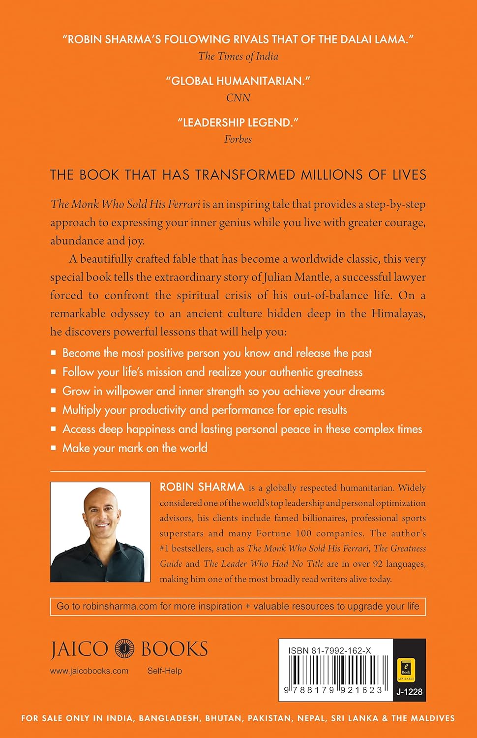 This inspiring tale provides a step-by-step approach to living with greater courage, balance, abundance, and joy. A wonderfully crafted fable, The Monk Who Sold His Ferrari tells the extraordinary story of Julian Mantle, a lawyer forced to confront the spiritual crisis of his out-of-balance life. On a life-changing odyssey to an ancient culture, he discovers powerful, wise, and practical lessons that teach us to: Develop Joyful Thoughts, Follow Our Life's Mission and Calling, Cultivate Self-Discipline and Act Courageously, Value Time as Our Most Important Commodity, Nourish Our Relationships, and Live Fully, One Day at a Time.